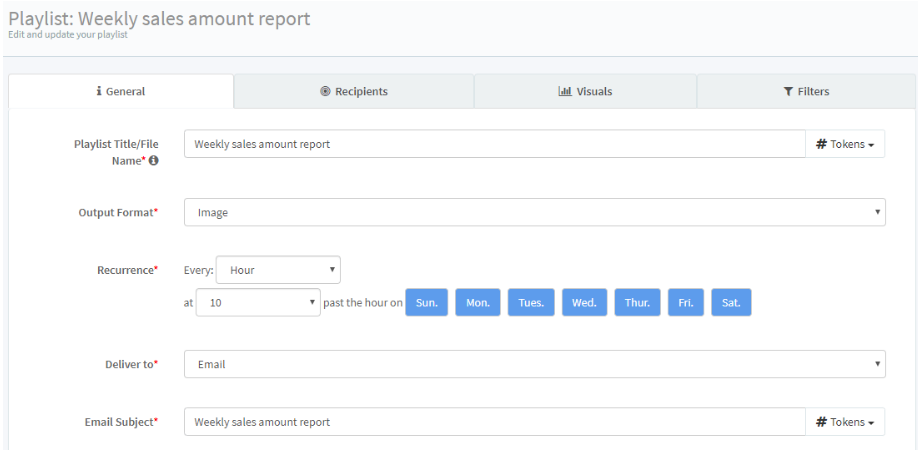 To start a new automation playlist, click the “Create” button. On the first tab (“General”), name the playlist, and choose the screenshot output format (image, single or multiple PDFs, single or multiple Excel files). Then, set the screen-capture recurrence (i.e. your data’s refresh rate) and how you want your data delivered (“Send to”).