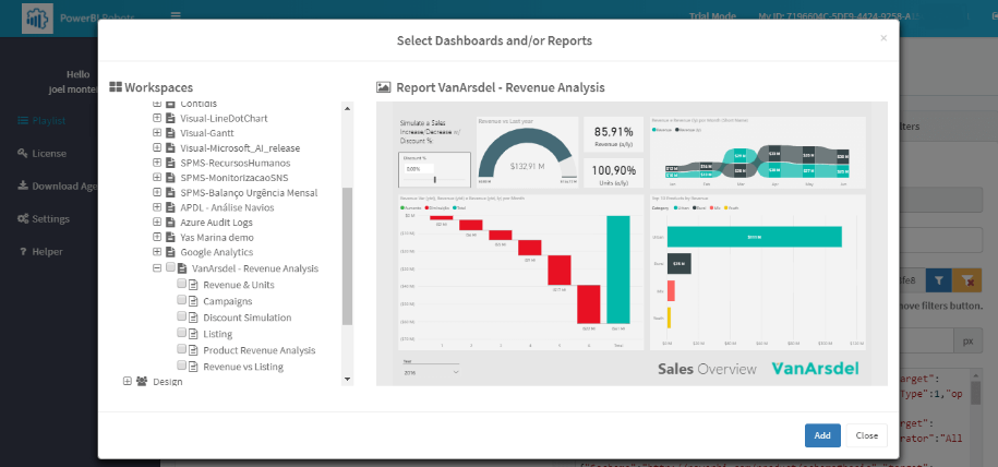 - A new window will open where you can navigate through you PowerBI items and once you select any item you will see a preview of that tile or report.