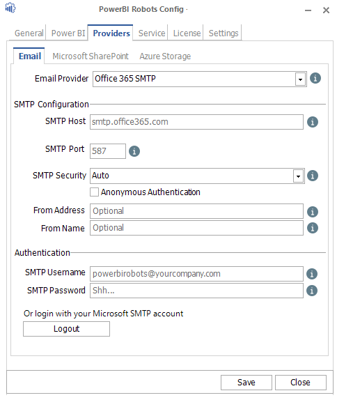If you’re using an SMTP service to send your reports by email or are sending them to a SharePoint library, this is where you configure them. If you don’t have the necessary information, please ask your IT manager.