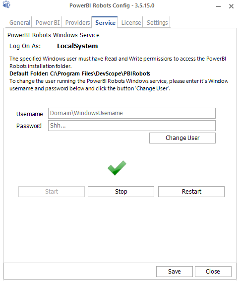 You can choose between using a built-in Local System user or a Specific user. For the latter, make sure that the specified user has read and write permissions to the installation folder (by default, C: ProgramFiles/DevScope/PBIRobots).