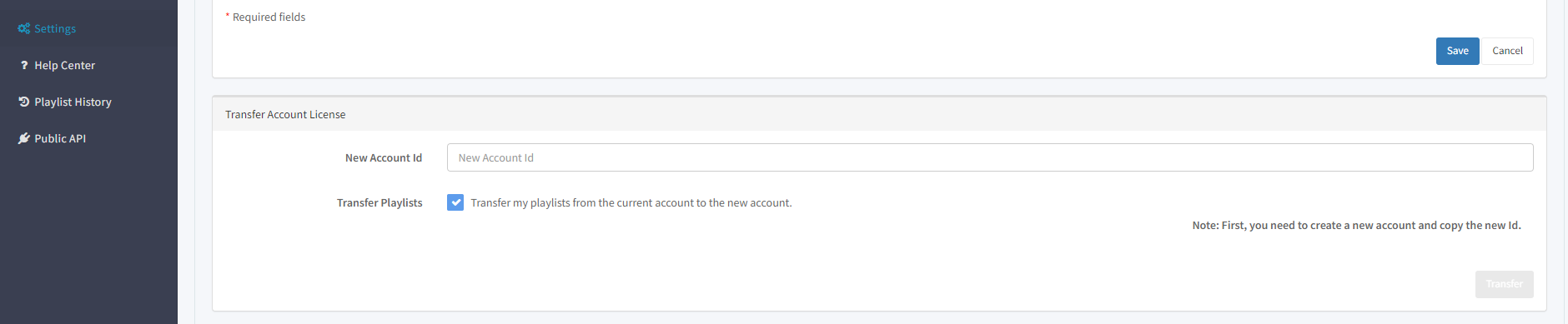 and in the Transfer Account License section type the new account ID where you want to migrate the information. Please note that the destination account needs to be created first.
