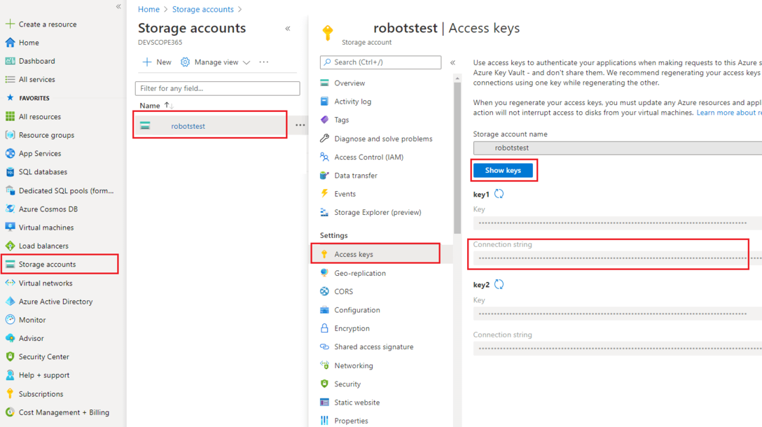 - Select the storage account of your choice, click on Access Keys and copy on the connection strings.