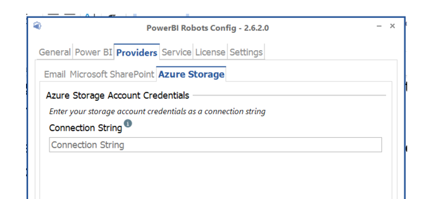 - Go to the Providers tab. Select the Azure Storage subtab, and paste the Azure Blob Storage connection string here.
