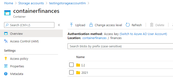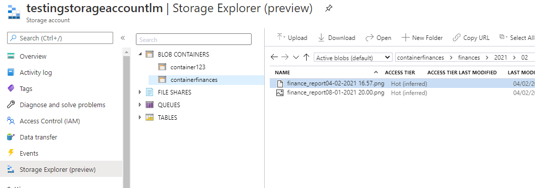 - According to the example above, in the Azure Blob Storage, a Year folder will be created inside our container, and a month folder will be created inside our Year folder: