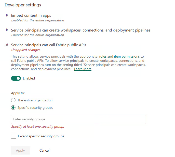 On Tenant Settings, go to the Developer Settings and toggle the Enabled slider under “Service principals can call Fabric public APIs”. Next, apply it to a "specific security group”, and add the PowerBI Robots security group you created on step 2.
