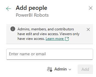 Select the 'PowerBI Robots' group, choose the 'Admin' role, click 'Add' and close the window. Also, search by the created App Registration and add it as an 'Admin' also.