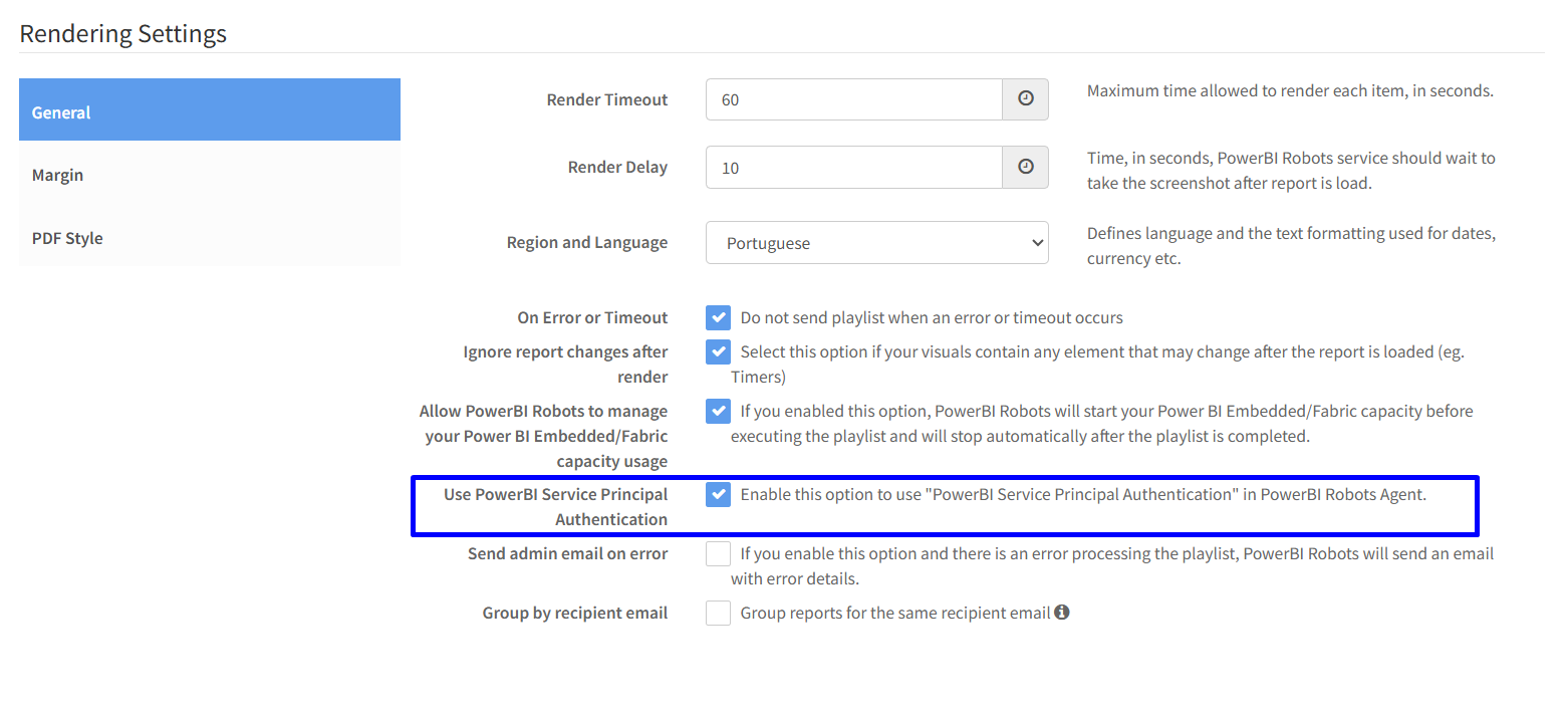 Under the General tab of the playlist configuration, enable the 'Use Power BI Service Principal Authentication' option.