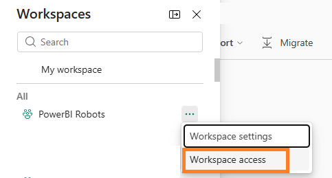 To share your reports, the Azure Group you created needs access to all the workspaces that it’s a part of. You should repeat the process in this step for each workspace with reports you want to share. In Power BI Online, go to “Workspaces”, click the dots next to one of your workspaces, and select "Workspace access" from the drop-down menu.