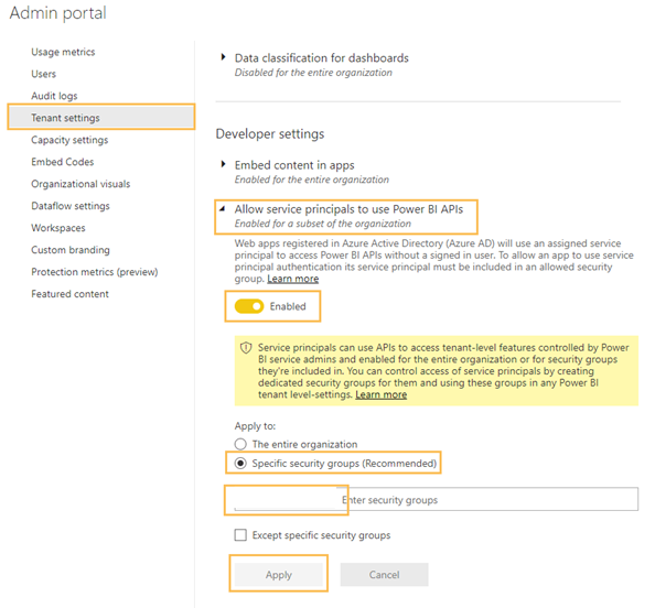 On Tenant Settings, go to the Developer Settings and toggle the Enabled slider under “Allow service principals to use Power BI APIs”. Next, apply it to a "specific security group”, and add the PowerBI Robots security group you created on step 2.